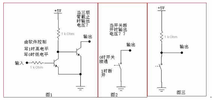 再看圖三。圖三中那個(gè)1K的電阻即是上拉電阻。如果開(kāi)關(guān)閉合,則有電流從1K電阻及開(kāi)關(guān)上流過(guò),但由于開(kāi)關(guān)閉和時(shí)電阻為0(方便我們的討論,實(shí)際情況中開(kāi)關(guān)電阻不為0,另外對(duì)于三極管還存在飽和壓降),所以在開(kāi)關(guān)上的電壓為0,即輸出電平為0。如果開(kāi)關(guān)斷開(kāi),則由于開(kāi)關(guān)電阻為無(wú)窮大(同上,不考慮實(shí)際中的漏電流),所以流過(guò)的電流為0,因此在1K電阻上的壓降也為0,所以輸出端的電壓就是5V了,