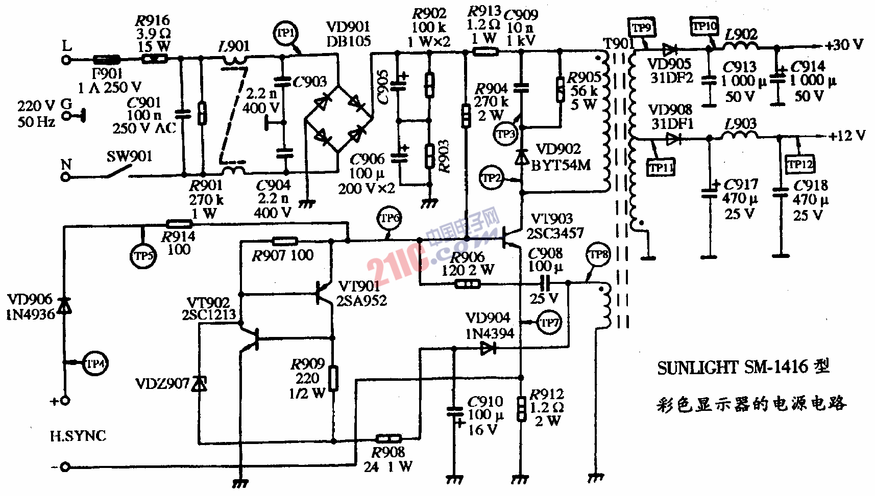 SUNLIHT SM-1416型彩色顯示器的電源電路圖