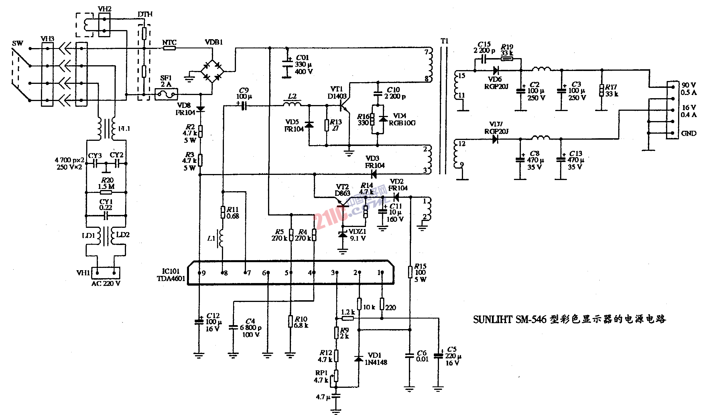 SUNLIHT SM-546型彩色顯示器的電源電路圖