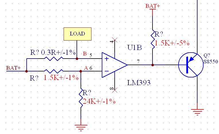 我是想當(dāng)BAT+為5V時(shí),LOAD為500MA負(fù)載時(shí),A點(diǎn)電壓為4.7V,B點(diǎn)為4.85V.輸出就是高電平S8550截止.