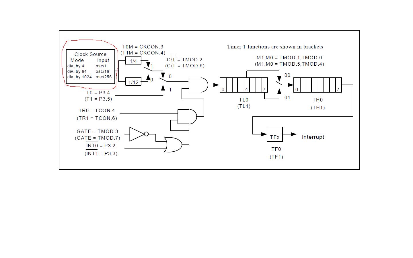 那么系統(tǒng)上電默認的就是4,W77E58接的是4M晶振,此時我想知道定時器時鐘輸入源的頻率是多大?如1樓圖所示