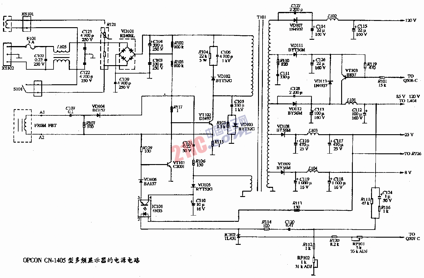 OPCON CN-1405型彩色顯示器的電源電路圖