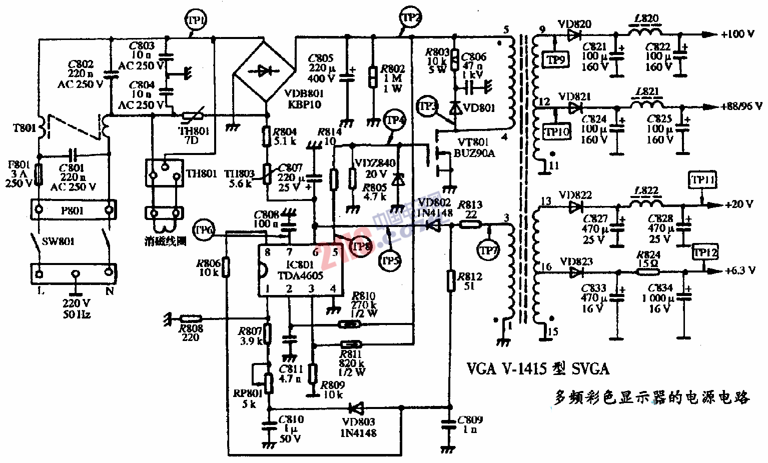 VGA V-1415型SVGA多頻彩色顯示器的電源電路圖