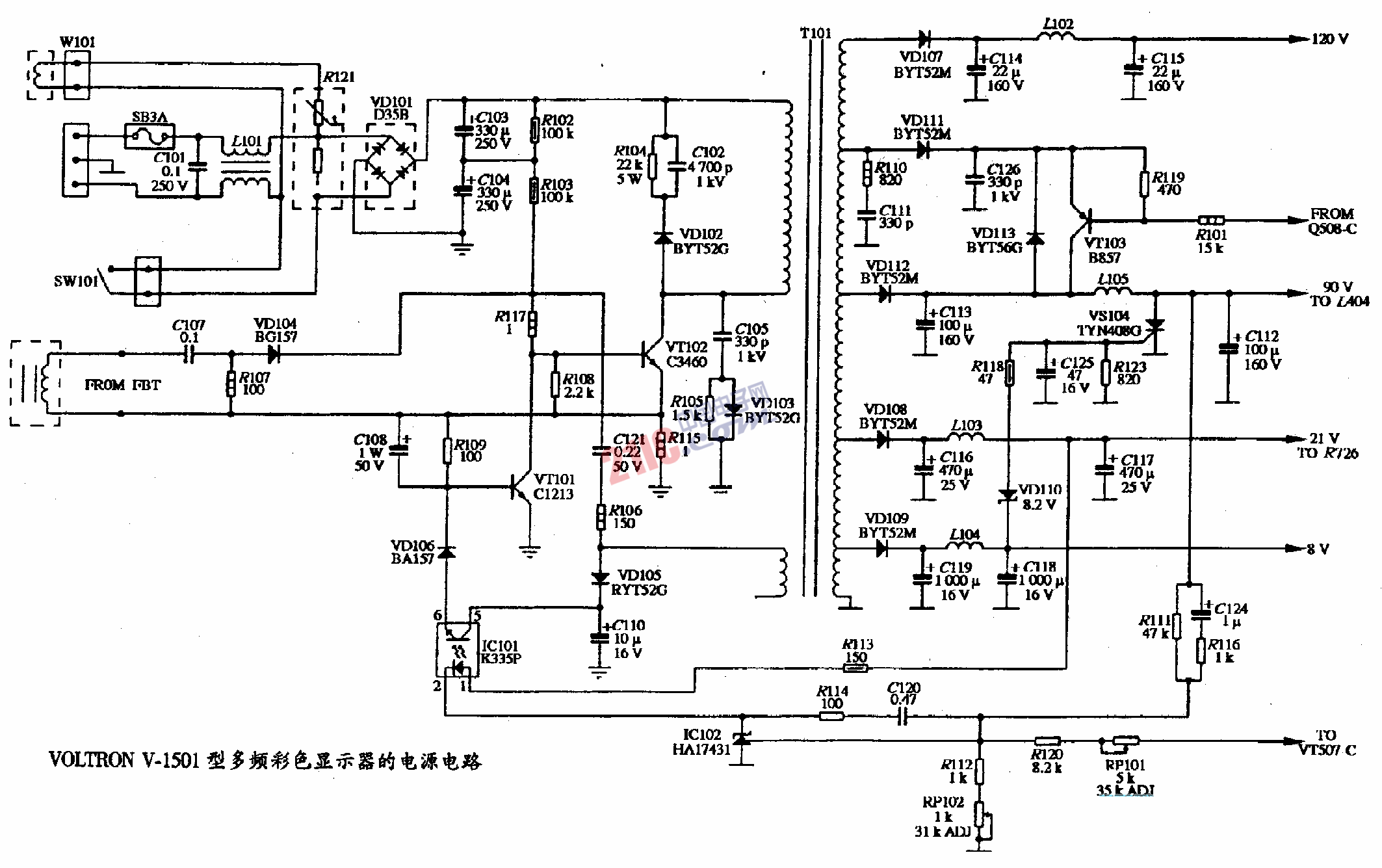 VOLTRON V-1501型多頻彩色顯示器的電源電路圖