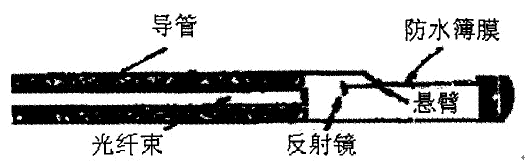 目前臨床上應(yīng)用的壓力傳感器主要用來(lái)測(cè)量血管內(nèi)的血壓、顱內(nèi)壓、心內(nèi)壓、膀胱和尿道壓力等。用來(lái)測(cè)量血壓的壓力傳感器示意見(jiàn)圖1。其中對(duì)壓力敏感的部分是在探針導(dǎo)管末端側(cè)壁上的一塊防水薄膜,一面帶有懸臂的微型反射鏡與薄膜相連,反射鏡對(duì)面是一束光纖,用來(lái)傳遞入射光到反射鏡,同時(shí)也將反射光傳送出來(lái)。當(dāng)薄膜上有壓力作用時(shí)。薄膜發(fā)生形變且能帶動(dòng)懸臂使反射鏡角度發(fā)生改變,從光纖傳來(lái)的光束照射到反光鏡上,再反射到光纖的端點(diǎn)。由于反射光的方向隨反射鏡角度的變化而改變,因此光纖接收到的反射光的強(qiáng)度也隨之變化[12]。這一變化通過(guò)光纖傳到另一端的光電探測(cè)器變成電信號(hào),這樣通過(guò)電壓的變化便可知探針處的壓力大小。