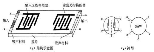 表面波濾波器的結(jié)構(gòu)示意圖及符號如下圖所示。它是以石英、鈮酸鋰或釬鈦酸鉛等壓電晶體為基片,經(jīng)表面拋光后在其上蒸發(fā)一層金屬膜,通過光刻工藝制成兩組具有能量轉(zhuǎn)換功能的交叉指型的金屬電極,分別稱為輸入叉指換能器和輸出叉指換能器。當(dāng)輸入叉指換能器接上交流電壓信號時,壓電晶體基片的表面就產(chǎn)生振動,并激發(fā)出與外加信號同頻率的聲波,此聲波主要沒著基片的表面的與叉指電極升起的方向傳播,故稱為聲表面波,其中一個方向的聲波被除數(shù)吸聲材料吸收,別一方向的聲波則傳送到輸出叉指換能器,被轉(zhuǎn)換為電信號輸出。