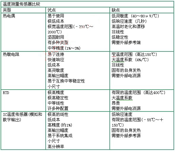 溫度傳感器有四種主要類型:熱電偶、熱敏電阻、電阻溫度檢測器(RTD)和IC溫度傳感器(見下表)。IC溫度傳感器又包括模擬輸出和數(shù)字輸出兩種類型。