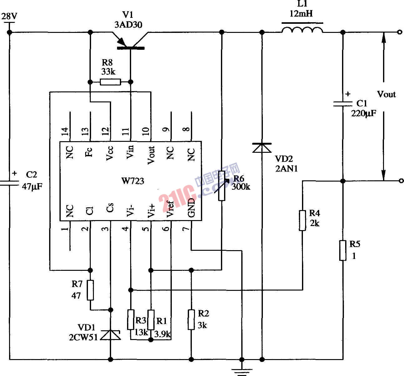 如圖所示是用W723多端可調(diào)式正集成穩(wěn)壓器組成的固定電流開關(guān)穩(wěn)壓器應(yīng)用電路,輸出電流l A。圖示電路中,W723的參考基準電壓(約7.2 V)通過Rl、R2分壓使大約3 V的電壓加至同相輸入端,同時還經(jīng)過電阻R3、R4分壓后加至反相輸入端,R4的低端又和分流電阻R5相連。當(dāng)反相和同相輸入端近似平衡時,分流電阻R5上的壓降為1 V左右。R6用于調(diào)節(jié)輸出紋波電流的極限值。如果要求最大輸出紋波電流為30 mA,則調(diào)節(jié)R6使滯后電壓為30 mV即可。當(dāng)電路的反饋回路要求增加電流時,穩(wěn)壓單元的輸出級導(dǎo)通,并使12 mA的電流脈沖進入W723的Vin端,驅(qū)動晶體三極管V。穩(wěn)壓二極管VDl用來偏置穩(wěn)壓單元的輸出級,而二極管VD2是用來消除反向尖脈沖的。電容C1和電感L組成濾波器,以便平整開關(guān)輸出波形。電路的最高工作頻率取決于負載的大小,其值一般為20 kHz。