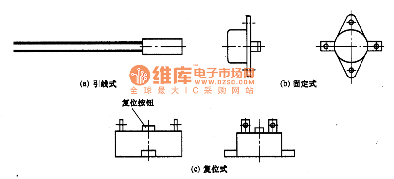 表列出了一些雙金屬片溫度繼電器的主要特性參數(shù),它們的外形結(jié)構(gòu)有三種形式,如圖所示。
