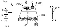 圖1、可控硅結(jié)構(gòu)示意圖和符號(hào)圖