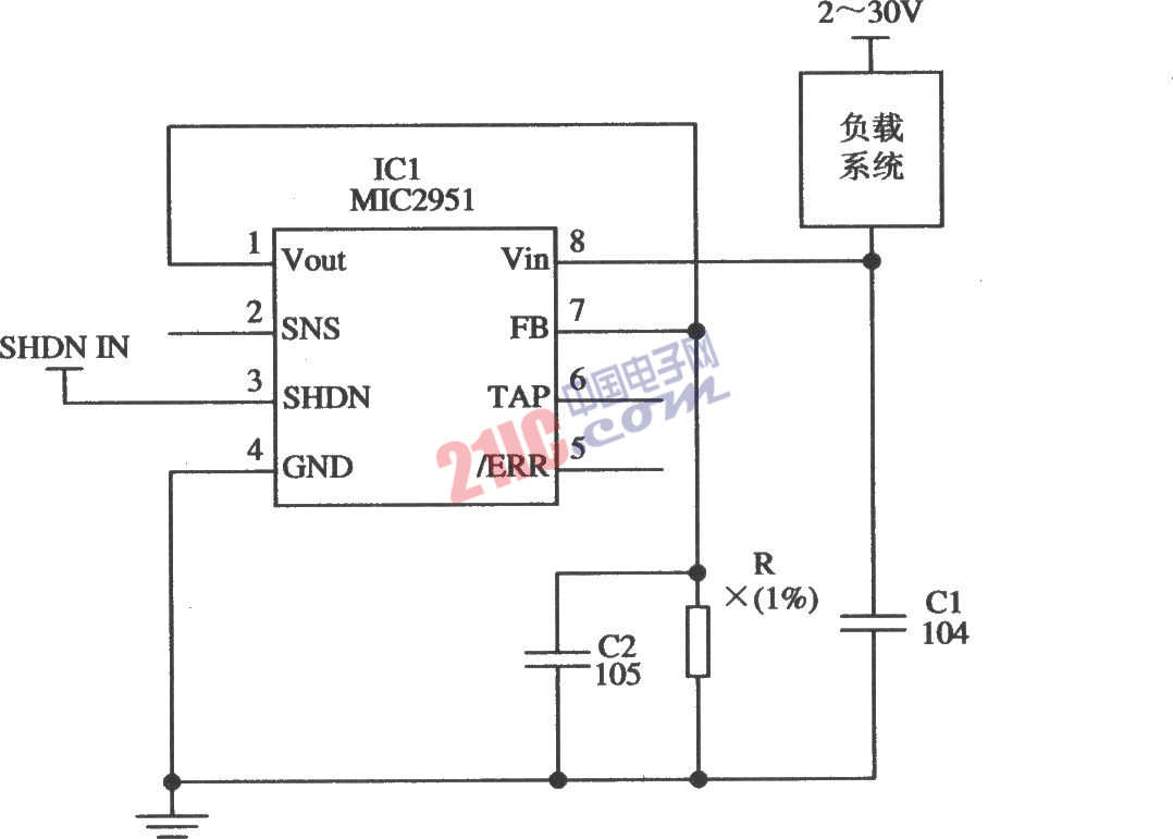 ,式中,R的取值應(yīng)遵循使MIC2951的輸出電流不得超出150 mA,R的精度要求為l%的原則。