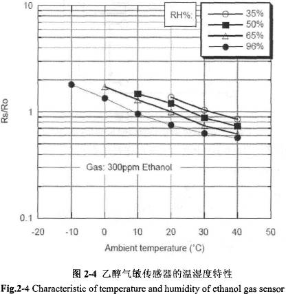 如圖2-4是TGS2620乙醇?xì)饷魝鞲衅鞯臏貪穸忍匦裕渲蠷o是20℃濕度為65[%]條件下的傳感器敏感元件的電阻值,Rs為300ppm乙醇?xì)怏w濃度條件下傳感器敏感元件電阻值。
