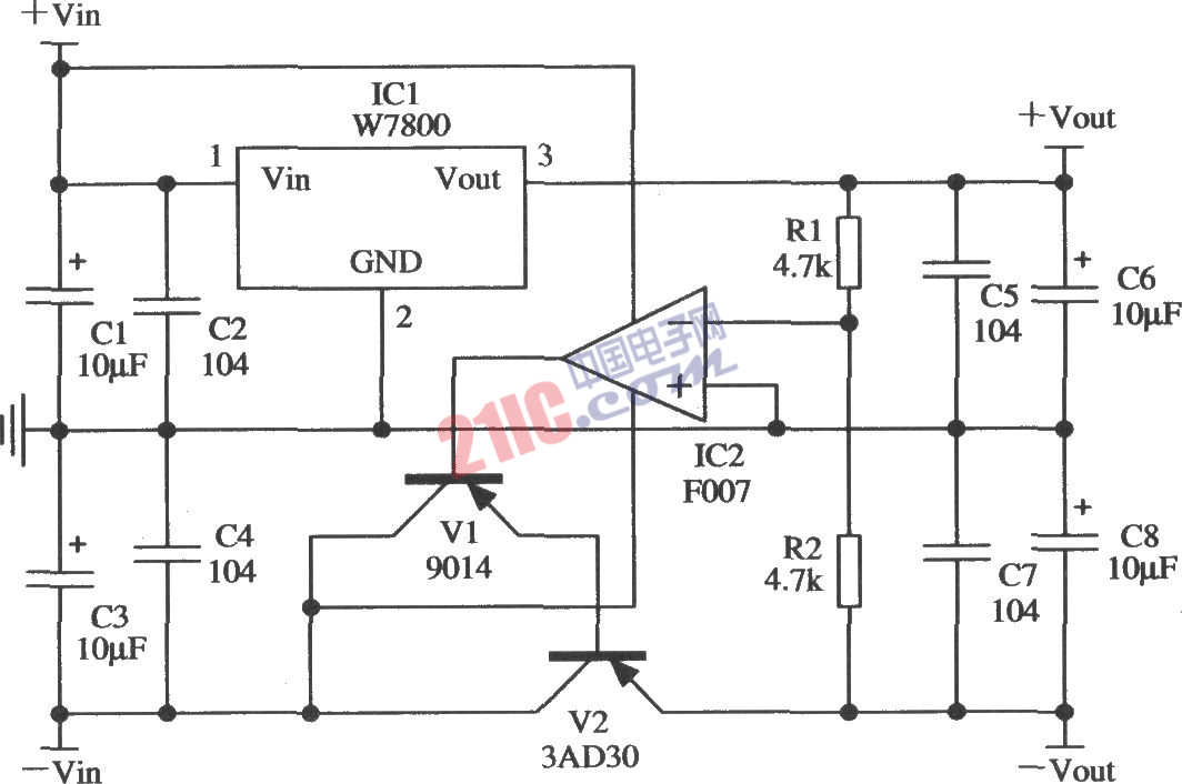 如圖所示是用W7800正集成穩(wěn)壓器和F007運(yùn)算放大器組成的跟蹤式穩(wěn)壓電源的應(yīng)用電路。在有些使用正、負(fù)電源的場(chǎng)合,需用負(fù)電源跟蹤正電源的變化。圖中用W7800 做正電源,用運(yùn)算放大器和功率管組成可跟蹤的負(fù)電源。圖中用兩只完全相同(精度要高)的4.7 kΩ電阻,將F007的輸入端電位控制在零電平,而用F007的輸出端去控制負(fù)電源回路中的調(diào)整管,以保持負(fù)輸出對(duì)正輸出的跟蹤。F007運(yùn)放的電源采用正、負(fù)的輸入電壓源。