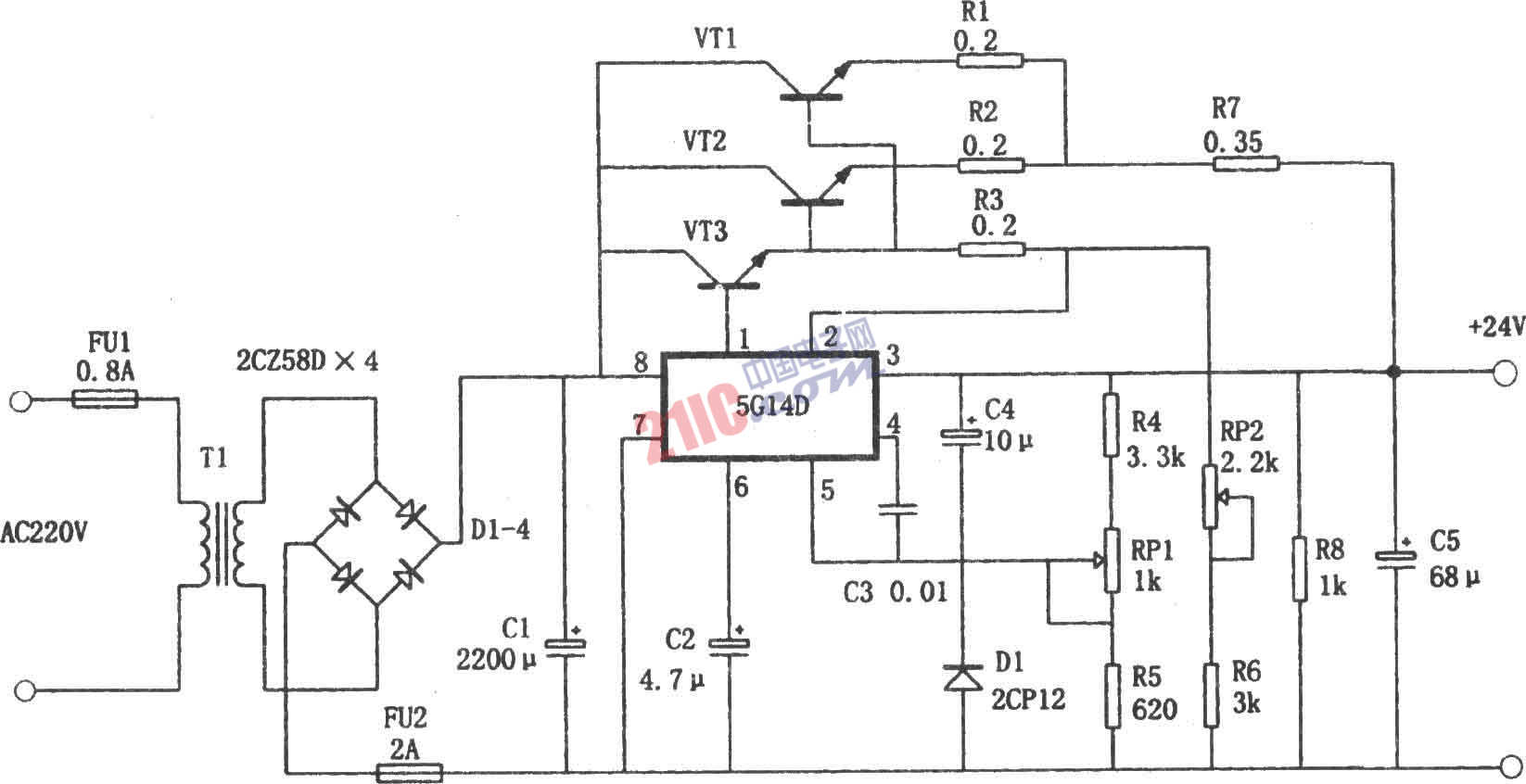如圖所示為一種+24V、1.9A電源電路。它以國(guó)產(chǎn)的集成穩(wěn)壓器5G14D為核心,外接三只功率晶體管,使電源的輸出電流由5G14D本身的額定電流24mA,提高到1.9A。RP1用來(lái)微調(diào)輸出電壓,RP2用來(lái)調(diào)整過(guò)載電流保護(hù)點(diǎn)。本電源的主要技術(shù)特點(diǎn):(1)輸入電壓:220V±22V,50Hz。(2)輸出電壓:24V,誤差≤±2%。(3)最大輸出電流:1.9A。(4)紋波電壓:≤24mV。(5)過(guò)載保護(hù)點(diǎn):2.8A。