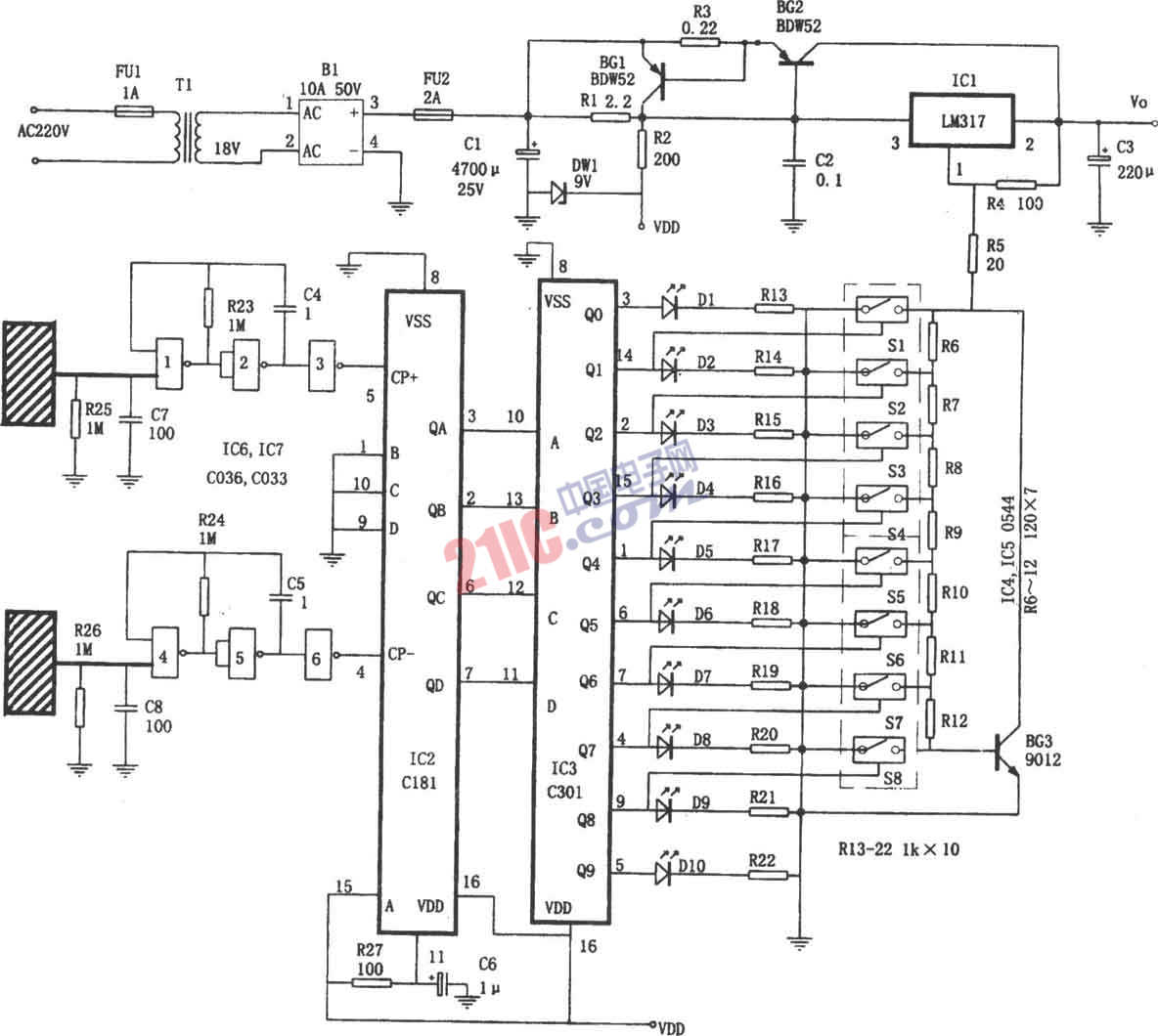 如圖所示為觸摸控制穩(wěn)壓電源。本電源采用數(shù)字集成電路和模擬開關(guān)控制LM317控制端(ADJ)與地之間的電阻值,從而代替了傳統(tǒng)的電位器,使得操作方便,只需觸摸金屬片就可調(diào)整輸出電壓。輸出電壓有:l.5V、3V、4V、5V、6V、7.5V、9V、12V 8擋,而且輸出電壓的大小由發(fā)光二極管直觀顯示,最大輸出電流為1.5A。