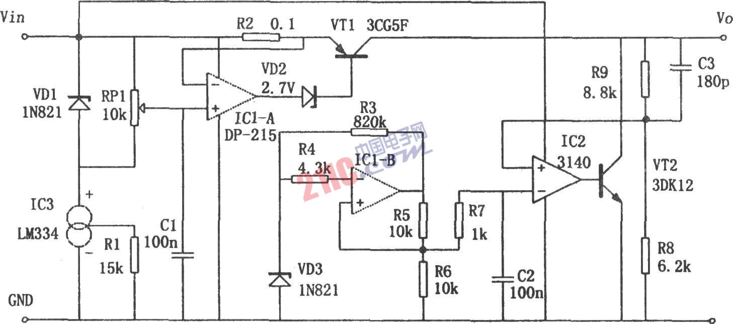 如圖所示為一種配合開關(guān)電源進(jìn)行工作的線性穩(wěn)壓電源。其特點(diǎn)是:高效率,低壓差;具有濾除高頻脈動電壓和瞬間突變電壓的能力;最適合于小負(fù)載的需求;具有限流功能。圖中,由VD3、IC1-b等元件產(chǎn)生基準(zhǔn)電壓。R8、R9構(gòu)成電壓取樣電路,對電源的輸出電壓進(jìn)行采樣。IC2和VT2等元件構(gòu)成誤差放大和并聯(lián)電壓調(diào)整電路。通過IC2對基準(zhǔn)電壓與取樣電壓的比較放大,驅(qū)動調(diào)整管VT2,進(jìn)而穩(wěn)定輸出電壓。由VD1、IC3、VD2、IC1-a、VT1等元件構(gòu)成限流電路。VD1、IC3和RP1形成可調(diào)的限流基準(zhǔn)電壓,通過IC1-a對此基準(zhǔn)電壓與R2(輸出電流的取樣電阻)上產(chǎn)生的取樣電壓進(jìn)行比較放大,形成誤差電壓。用該誤差電壓控制調(diào)整管VT1的工作狀態(tài),從而穩(wěn)定和限制輸出電流。