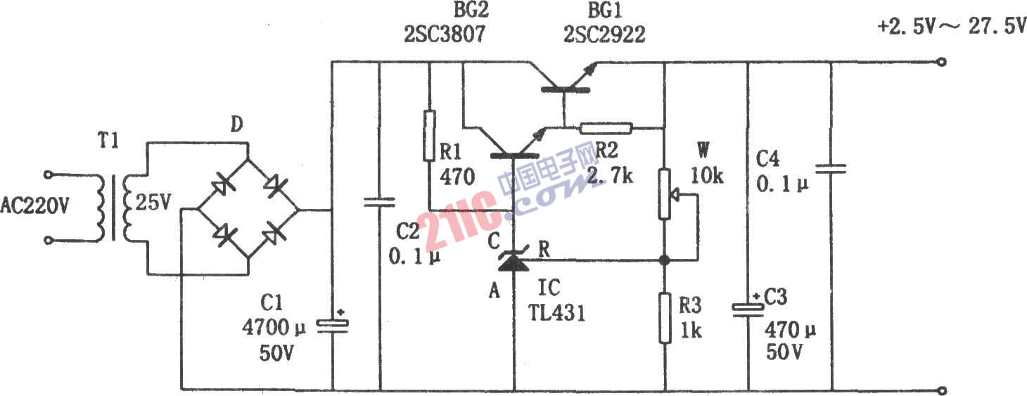 如圖所示為一實(shí)用的高精度可調(diào)電源電路。該電路以具有溫度補(bǔ)償特性的、高精度的標(biāo)準(zhǔn)電壓源集成電路TL431為核心,配合復(fù)合調(diào)整管BG1、BG2等元件構(gòu)成穩(wěn)壓電源,輸出電壓在2.5~27.5V之間連續(xù)可調(diào),輸出電流≥5A,電壓紋波≤5mV。
