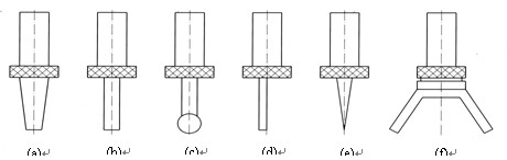 圖d為半球形測端,其直徑較大,用于測量粗糙表面。圖e為圓柱形測端,用于測量螺紋外徑和薄板。(a)球形測端?? (b)盤形測端?? (c)尖錐形測端?? (d)半球形測端?? (e) 圓柱形