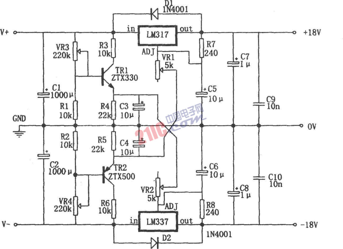 如圖所示為0~±30V、1.5A電源。從圖中可以看出本電源的特點(diǎn)是其正負(fù)輸出電壓最小可以調(diào)到0V。LM317(LM337)正常情況下只能調(diào)到1.25(-1.25)V,但在可調(diào)三端的調(diào)整端加上了適量的反偏,使輸出電壓可以調(diào)到零。這一點(diǎn)是通過TH2的發(fā)射極的負(fù)電壓接在VR1上,將TH1發(fā)射極的正電壓接在VR2上而實(shí)現(xiàn)的。