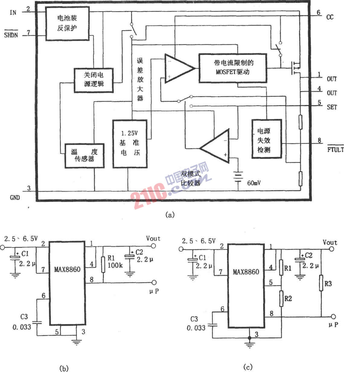 MAX8860的內(nèi)部結(jié)構(gòu)、管腳排列如圖(a)所示。它由1.25V基準(zhǔn)電壓源,誤差放大器,MOSFET驅(qū)動(dòng)器、P溝道MOSFET調(diào)整管、雙模式電壓比較器、電源失效檢測(cè)器及內(nèi)部反饋的電壓分壓器組成。