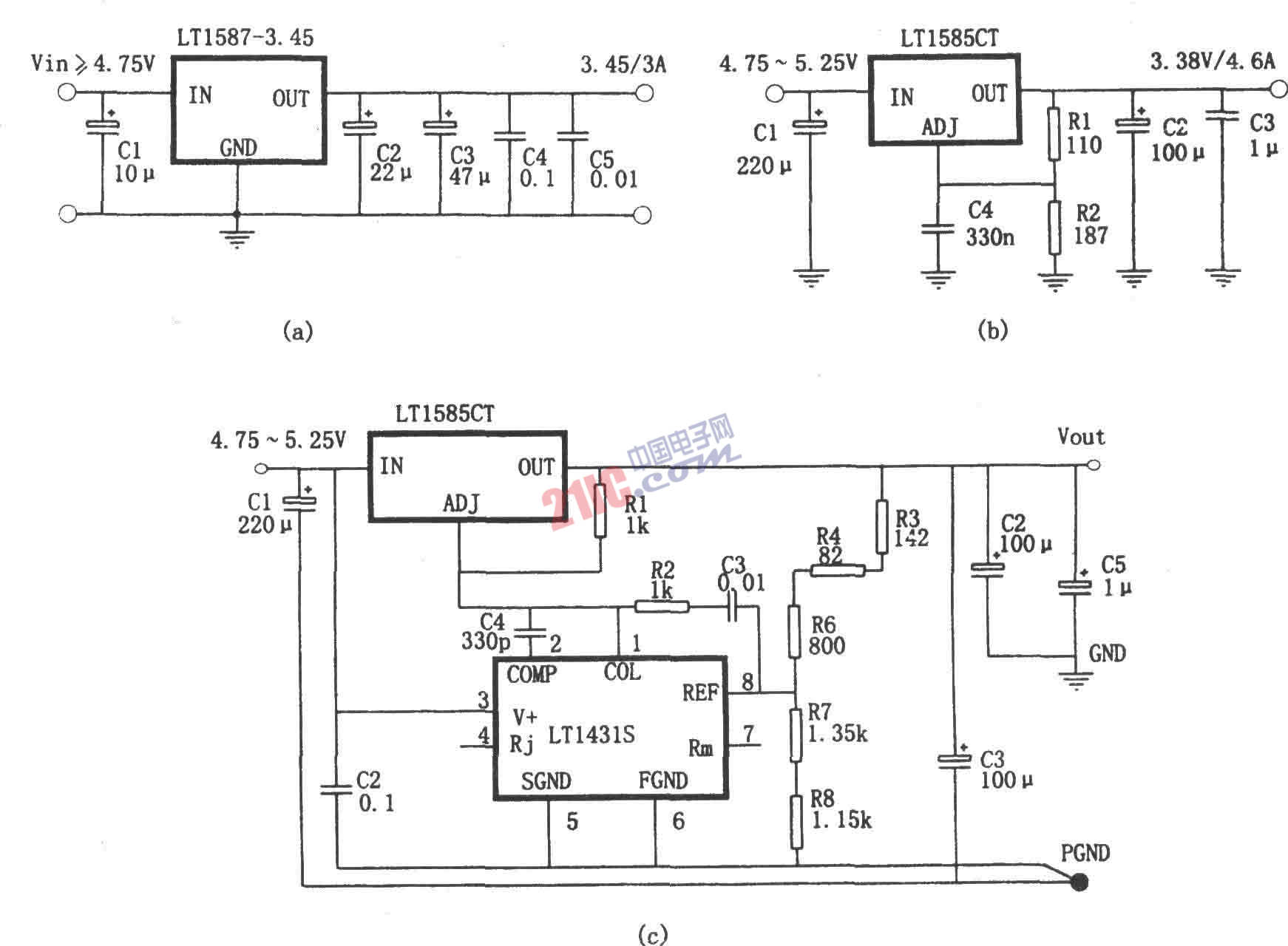 圖(a)是采用LT1587-3.45構(gòu)成的微處理機電源電路。圖(b)是采用LT1585構(gòu)成的輸出電壓可調(diào)的穩(wěn)壓電源。圖(c)是采用LT1584和LT1431構(gòu)成的微機電源。LT1584、LTl585、LT1587的輸出電流為7A、4.6A、3A,是最適用于驅(qū)動微處理機的穩(wěn)壓器,具有高速過度響應(yīng)特性,負載調(diào)整率為0.5%,內(nèi)有熱擊穿保護電路?;緫?yīng)用電路非常簡單,固定輸出電壓時,只要在輸入與輸出端各接l只電容;可調(diào)輸出電壓時,再接上用于設(shè)定輸出的2只電阻即可,輸入輸出的電容容量可非常小。