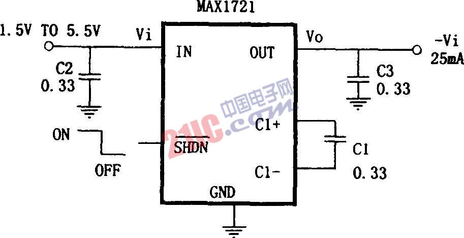 如圖所示為采用微型(SOT23封裝)反相電荷泵集成電路MAX1721構(gòu)成的微型極性反轉(zhuǎn)電源。本電路只需在MAX1721的外部接一只0.33μF的小容量、小尺寸的電容器,就可完成極性反轉(zhuǎn),即輸出電壓Vo=-Vi。