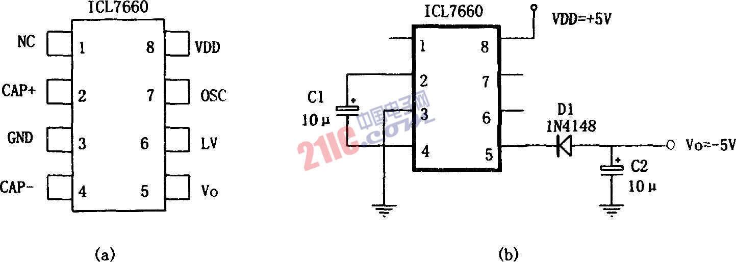 如圖所示為由ICL7660和外部的兩只電容組成的極性變換電源。該電源采用專用極性變換集成電路ICL7660和外部的兩只電容構成的電荷泵進行DC/DC電壓極性轉換。其轉換效率高,為95%,電能消耗小。靜態(tài)電流為0.5mA,輸出電流為10~20mA。