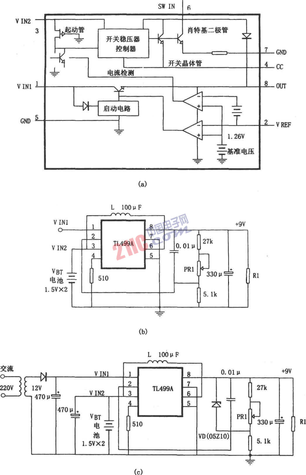 圖(c)所示為采用TL499A構(gòu)成的電池后備電源電路。若輸入端VIN1(1腳)加直流電壓,就可獲得9V輸出電壓。它工作于線性穩(wěn)壓器狀態(tài),噪聲非常小,但前提是輸入電壓VIN1應比輸出電壓VOUT高出1V。在圖(b)所示電路中,TL499A 1腳的輸入電壓VIN1可由交流220V通過變壓整流來提供,作為本電源電路的主要供電電壓。若VIN1為10V以上,就工作于線性穩(wěn)壓器狀態(tài);若輸入電壓VIN1低于l0V,就工作于開關穩(wěn)壓器狀態(tài),此時由電池通過TL499A③腳供電,經(jīng)升壓變換后輸出。停電時電池作為后備電源,這樣可方便構(gòu)成不間斷電源。線性穩(wěn)壓器與開關穩(wěn)壓器之間的轉(zhuǎn)換在TL499A的內(nèi)部自動進行,雖然輸出電壓有些變動,但只有2%左右,一般用途不受影響。輸入電壓VIN1最高為32V。