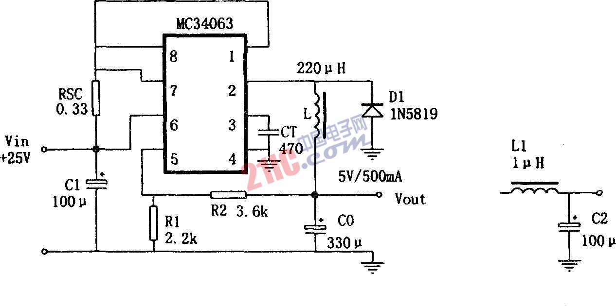 如圖所示為用MC34063制作的降壓變換電源。MC34063是一種開關(guān)型高效DC/DC變換集成電路。它的內(nèi)部含有具有溫度補(bǔ)償?shù)幕鶞?zhǔn)電壓源、比較器、具有限電流電路的占空比可控的振蕩器、驅(qū)動(dòng)器和大電流輸出開關(guān)管。用它制作的+25/+5V降壓變換電源如圖所示,其特點(diǎn)是:(VIN=25V,Io=500mA時(shí))線性調(diào)整率為12mV±0.12%;負(fù)載調(diào)整率為3mV±0.03%;紋波電壓為120mV。如果加一級(jí)濾波器(如圖中所示)輸出紋波降為40mV;變換效率為82%;短路限制電流為1.1A。