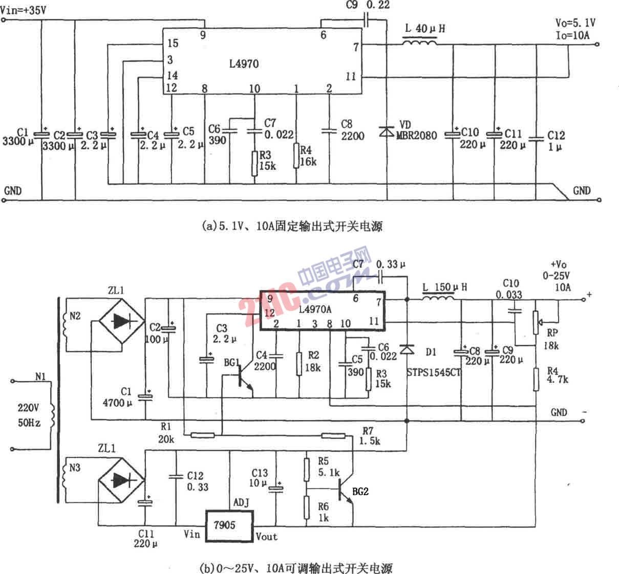如圖所示為由L4970A構(gòu)成的大功率開(kāi)關(guān)電源。L4970A是一種大功率單片開(kāi)關(guān)集成穩(wěn)壓器,該芯片采用SIP-15封裝,其特點(diǎn)是;(1)輸入電壓必須>11V,一般為15~40V之間;(2)輸出電壓:固定輸出5.1V,也可通過(guò)外部電路設(shè)置成可調(diào)輸出,范圍在5.1~40V;(3)最大輸出電流為10A;(4)工作頻率200kHz;(5)內(nèi)部設(shè)有欠壓檢測(cè)、掉電復(fù)位、功率級(jí)軟啟動(dòng)等特殊電路。