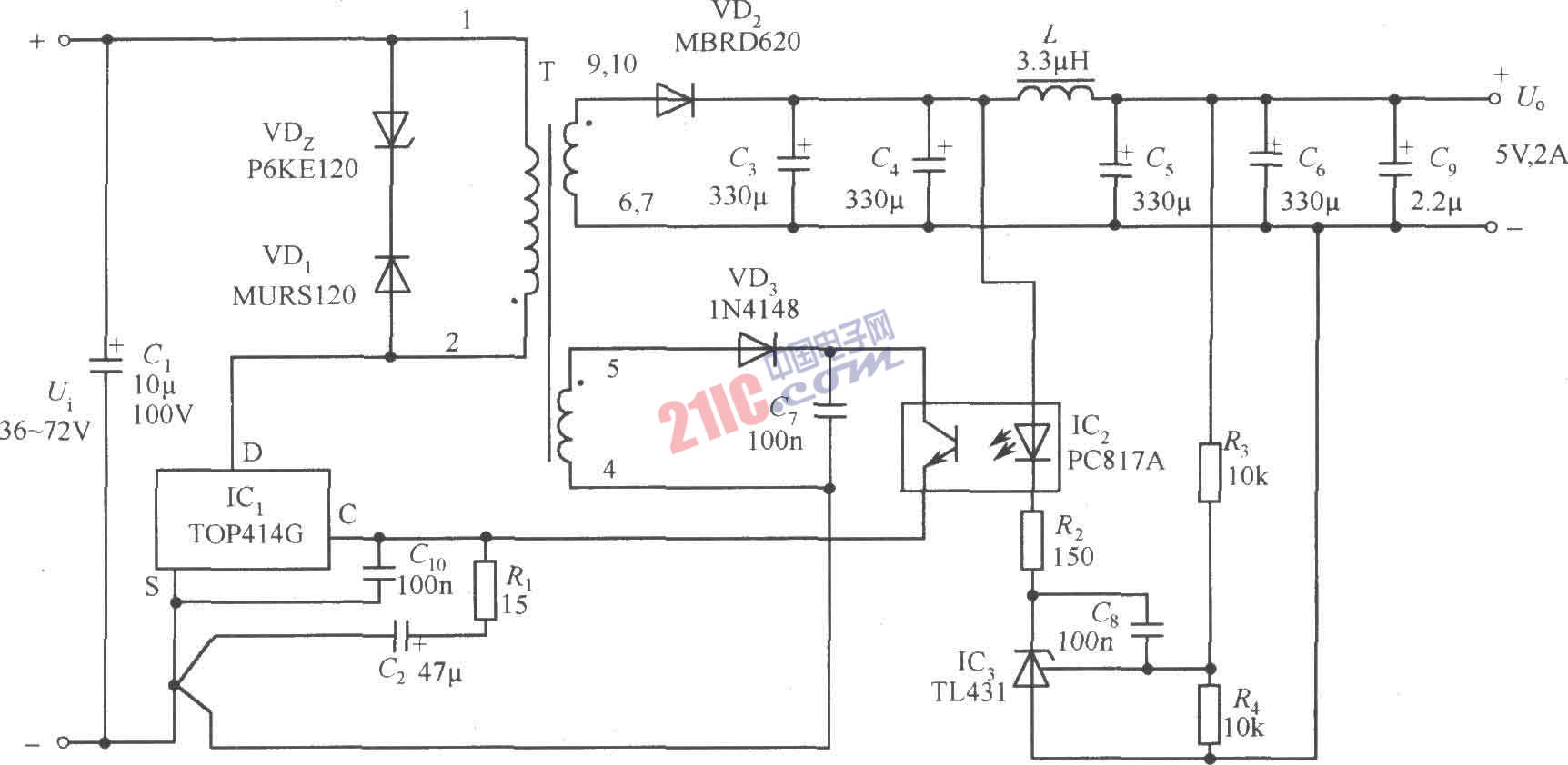 由TOP414G構(gòu)成的5V、2A輸出的隔離式開關(guān)電源電路如圖所示。C1為輸人濾波電容。VDz和VD1組成一次側(cè)鉗位保護電路。R1為控制端電阻,C2是旁路電容。TOP414GC-S端之間并聯(lián)的C10是防止在控制端出現(xiàn)高頻干擾時而引起觸發(fā)斷電電路誤動作。VD2為輸出整流二極管、C3、C4、L、C5和C6構(gòu)成的輸出濾波器,C9為輸出端消噪電容。外部誤差放大器由并聯(lián)穩(wěn)壓器TL431組成。當(dāng)輸出電壓發(fā)生波動時,經(jīng)R3、R4分壓后得到取樣電壓,就與TL431的基準(zhǔn)電壓進行比較,產(chǎn)生一個外部控制信號,再通過光耦合器PC817A來改變TOP414G控制端電流,進而調(diào)節(jié)占空比使Uo趨于穩(wěn)定??刂骗h(huán)路的增益是由R2來設(shè)定的。反饋繞組電壓經(jīng)VD3、C7整流濾波后,給PC817A中的紅外接收管供電。
