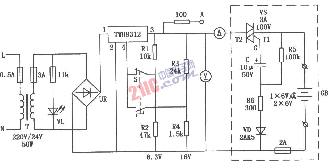 密封式鉛酸蓄電池充電電路,如圖所示。它一次可對l只或2只6V、4Ah的蓄電池進行充電。穩(wěn)壓部分采用開關式穩(wěn)壓電源組件TWH9312,輸入電壓范圍寬;內(nèi)部還設有過流、短路保護,工作安全可靠。