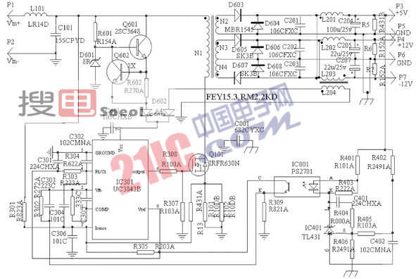 電源工作原理如下:電路采用單端正激變換電路,當變換器接通電源時,輸入直流電壓經由電阻、12V穩(wěn)壓管D601和三極管Q601、Q602組成的電路穩(wěn)壓降壓后, 啟動UC3843進入正常工作,偏置繞組L204的供電電路開始工作,輸出經A4和C601整流及濾波后輸出12V電壓,高于自供電電壓,使二極管A4反偏,啟動電路停止工作。變換器進入正常工作后,電源依據(jù)PWM脈寬調制方式工作,次級繞組的輸出經過二極管整流以及電容器和電感器組成的LC型濾波器濾波后,產生所需的各路輸出直流電壓。+5V的輸出電壓由電阻器R402和R406分壓后,與可編程穩(wěn)壓源TL431(U3)中的2.5V參考電壓比較,然后通過光耦合器U2反饋到UC3843的2腳,控制脈沖的占空比,穩(wěn)定5V輸出。耦合電感L202和L203實現(xiàn)+/-12V兩路穩(wěn)壓。過流保護電阻R101、R102檢測到開關管的過流信號,送入3843的3腳,封鎖UC3843的輸出信號,實現(xiàn)過流保護。