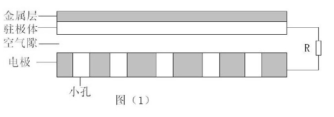 話筒的基本結構由一片單面涂有金屬的駐極體薄膜與一個上面有若干小孔的金屬電極(背稱為背電極)構成。駐極體面與背電極相對,中間有一個極小的空氣隙,形成一個以空氣隙和駐極體作絕緣介質,以背電極和駐極體上的金屬層作為兩個電極構成一個平板電容器。電容的兩極之間有輸出電極。由于駐極體薄膜上分布有自由電荷。當聲波引起駐極體薄膜振動而產生位移時;改變了電容兩極版之間的距離,從而引起電容的容量發(fā)生變化,由于駐極體上的電荷數始終保持恒定,根據公式:Q =CU 所以當C變化時必然引起電容器兩端電壓U的變化,從而輸出電信號,實現聲-電的變換。實際上電容話筒的內部結構如圖(2)。