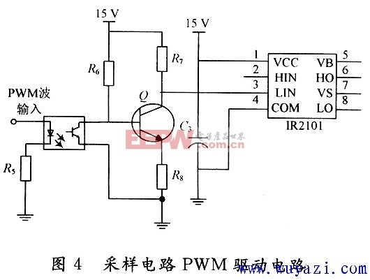 由于單片機(jī)為弱電系統(tǒng),為保證安全需要與強(qiáng)電側(cè)隔離,防止強(qiáng)電側(cè)的電壓回流,燒壞MSP430,先用開關(guān)光耦進(jìn)行光電隔離,再經(jīng)三極管到MOSFET的驅(qū)動電路IR210l。MSP430產(chǎn)生的PWM波,經(jīng)過光耦及后面的IR2101芯片,在芯片的5管腳輸出的PWM波接到MOS—FET的門極G端,使其工作。IR2101是專門用來驅(qū)動耐高壓高頻率的N溝道MOSFET和IGBT的。它是一個8管腳的芯片,其具有高低側(cè)的輸出參考電平。門極提供的電壓范圍是10~20 V。