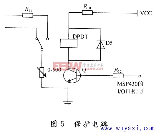 過電流保護(hù)是一種電源負(fù)載保護(hù)功能,以避免發(fā)生包括輸出端子上的短路在內(nèi)的過負(fù)載輸出電流對電源和負(fù)載的損壞。當(dāng)電流大于限定值的時候,使用繼電器常閉觸點斷開進(jìn)行保護(hù)。用MSP430單片機(jī)控制繼電器的常開常閉的吸合,實現(xiàn)自動恢復(fù)電路工作的功能。如圖5所示: