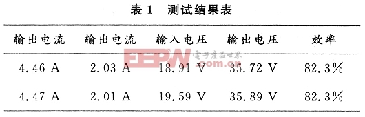 在選定開關(guān)元件之后,效率主要受開關(guān)頻率的影響、儲能電感的內(nèi)阻以及線路中其他器件損耗影響,因此在器件選取上要注重其損耗的高低。對此系統(tǒng)的進(jìn)行綜合測試,結(jié)果如表1所示。