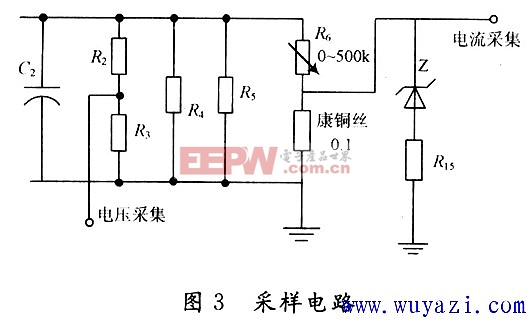 采樣電路為電壓采集與電流采集電路,采樣電路如圖3所示。其中P6.O,P6.1為MSP430芯片的采樣通道,P6.O為電壓采集,P6.1為電流采集。