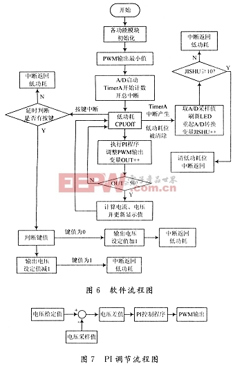 MSP430單片機(jī)內(nèi)部具有高、中、低速多個時鐘源,可以靈活地配置給各模塊使用以及工作于多種低功耗模式,大大降低控制電路的功耗提高整體效率;430F449有ADCl2模塊能夠?qū)崿F(xiàn)12位精度的模數(shù)轉(zhuǎn)換、硬件乘法器以及帶有PWM輸出功能的TIMERA和TIMRB定時器,使得整個電路不需要任何擴(kuò)展就能完成對電源輸出電壓、電流的實時采集、PI控制、PWM輸出;同時MSP430F449帶有內(nèi)部LCD驅(qū)動模塊,直接將液晶顯示屏連接在芯片的驅(qū)動端口即可,電路結(jié)構(gòu)極為簡單。本設(shè)計的軟件采用C語言編寫,整個程序包括的子模塊有:鍵盤控制模塊、A/D電壓和電流采集模塊、PI控制模塊和PWM波發(fā)生模塊等幾個部分,軟件流程圖如圖6所示。