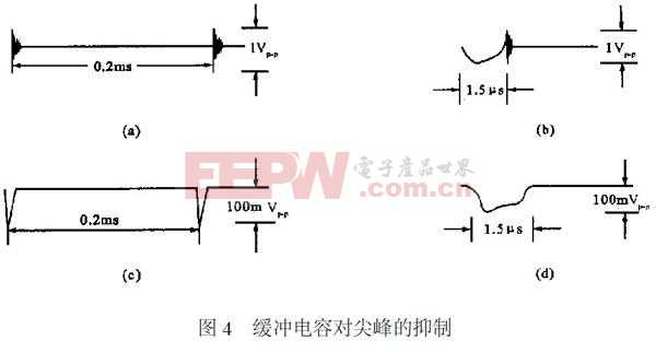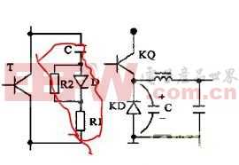 圖2 開關(guān)KD的速度 在開關(guān)三極管的CE間,或是在續(xù)流二極管的兩端并聯(lián)RC緩沖電路可使尖峰干擾明顯減小。圖3中,三極管T關(guān)斷時,集電極電壓上升,通過D和R1對C充電,使其上升速率變緩,選擇充電常數(shù)CR1的值可以控制上升速率。T導(dǎo)通時,D截止,C對R1和R2放電,限制了導(dǎo)通瞬間的峰值電流。該緩沖電路改變了負載線的形狀,減少了開關(guān)三極管的損耗。在續(xù)流二極管兩端并上RC電路也同樣有效。圖3中,當(dāng)用3DD11和2CK120C時,可并0.022LF左右的電容器(f=2kHz),該電容的容量有一最佳值,它的作用可以從圖4看出。圖4(a)是不加C的情況,將其在時間軸上放大后為圖4(b)。并上緩沖電容后分別見圖4(c)和(d)。