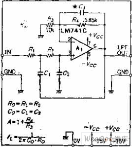 “由OP放大器構(gòu)成的12DB/OCT低通濾波器”介紹的低通濾波器為保證獲得0.707的Q值而造成各電容器的容量不一致,按計(jì)算的容量選取電容非常困難。本電路C1、C2的電容量相同,截止頻率一旦確定,即可選取CO=C1=C2的合適值,然后反算RO所需的阻值。