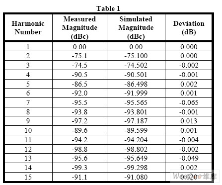 為驗證本文所述的方法,使用一臺頻譜分析儀來測量一個14位DAC的輸出;該DAC由一個代表理想正弦波的輸入序列驅(qū)動。記錄了前14次諧波的幅值(2次到15次,單位dBc),并利用這些值重構(gòu)DAC傳遞函數(shù)f(x)。然后,將理想正弦輸入序列g(shù)(t)代入重構(gòu)的DAC傳遞函數(shù)f(x)進行模擬,產(chǎn)生一個輸出序列。一個FFT將u(t)轉(zhuǎn)換為頻域等效值U(ω)。從U(ω)提取諧波幅值,并將其與頻譜分析儀的測量結(jié)果相比較,如表1所示。請注意,與7次諧波相關(guān)的最大誤差僅為0.065 dB。