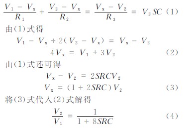 ????? 設(shè)輸入為V1,運放輸出為V2,電阻R1,R2 和R3交點的電位是Vx,電阻R2的阻值是R,R1和R3的阻值是2R,下面推導它的傳輸函數(shù),根據(jù)運放的性質(zhì)可得: