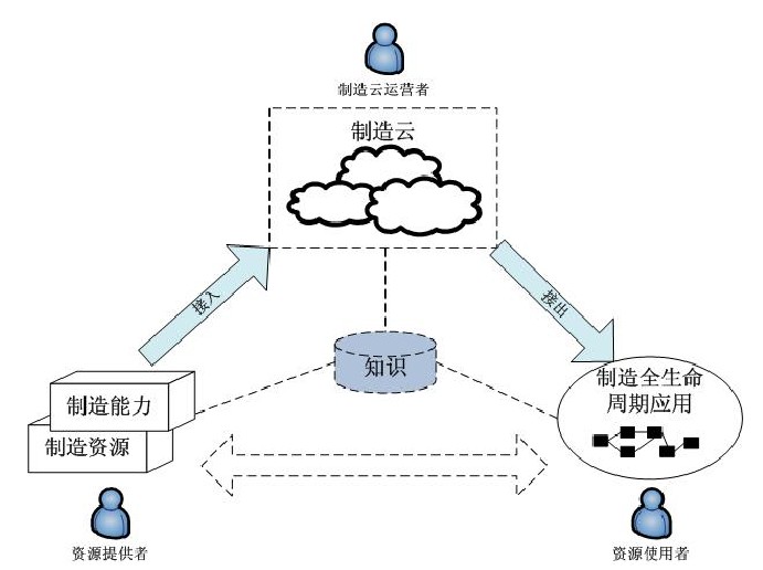 從上圖可以看出,云制造系統中的用戶角色主要有三種,即:資源提供者、制造云運營者、資源使用者。資源提供者通過對產品全生命周期過程中的制造資源和制造能力進行感知、虛擬化接入,以服務的形式提供給第三方運營平臺(制造云運營者);制造云運營者主要實現對云服務的高效管理、運營等,可根據資源使用者的應用請求,動態(tài)、靈活的為資源使用者提供服務;資源使用者能夠在制造云運營平臺的支持下,動態(tài)按需地使用各類應用服務(接出),并能實現多主體的協同交互。在制造云運行過程中,知識起著核心支撐作用,知識不僅能夠為制造資源和制造能力的虛擬化接入和服務化封裝提供支持,還能為實現基于云服務的高效管理和智能查找等功能提供支持。