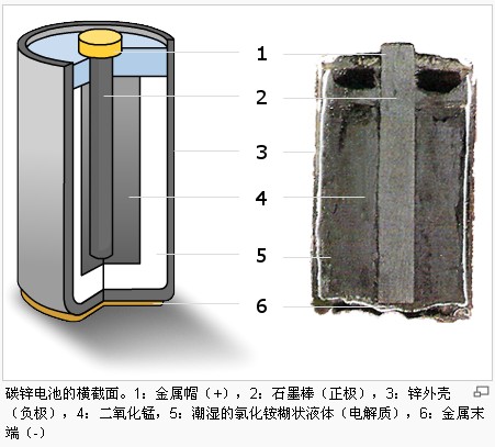 碳鋅電池的容器是一個(gè)鋅罐。里面有一層由NH4Cl和ZnCl2所構(gòu)成的糊狀液體,這個(gè)糊狀液體通過一個(gè)紙層與粉末狀的碳和二氧化錳隔開。這些粉末填充在一個(gè)碳棒的周圍。