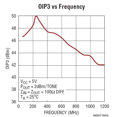 LTC6430-15,在100Ω差分環(huán)境中,于20MHz至1GHz及更高頻率范圍內(nèi)實(shí)現(xiàn)了很大的動(dòng)態(tài)范圍;在240MHz時(shí),A級版本OIP3的典型值為50dBm,經(jīng)過全面測試并保證最小值為47dBm.噪聲指數(shù)為3dB,這對應(yīng)于1nV/√Hz 輸入?yún)⒖挤糯笃髟肼?。DC功耗為800mW.這種低噪聲和低失真相結(jié)合,為高性能中頻通信和CATV應(yīng)用提供了寬動(dòng)態(tài)范圍。