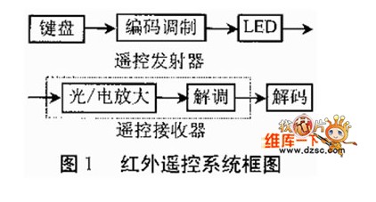 通用紅外遙控系統(tǒng)由發(fā)射和接收兩大部分組成,應(yīng)用編/解碼專用集成電路芯片來進(jìn)行控制操作,如圖1所示。發(fā)射部分包括鍵盤矩陣、編碼調(diào)制、LED紅外發(fā)送器;接收部分包括光、電轉(zhuǎn)換放大器、解調(diào)、解碼電路。