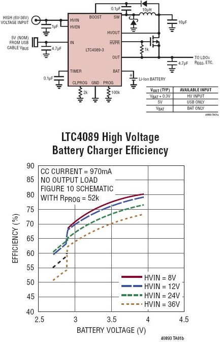 LTC4089-3 提供了一種可跟蹤電池電壓的自適應輸出功能,用于在采用高電壓輸入時實現(xiàn)高效充電。標準 LTC4089 的這款 3.95V 版本適合那些具有擴展電池壽命要求或者需要進行高溫 (大約 >60°C) 操作或存儲的應用。在這些條件下,降低浮動電壓將犧牲一定的初始電池容量,以增加整個電池壽命期間的容量保持率。充電電流是可設置的,而且,一個充電結束狀態(tài)輸出 (CHRG) 負責指示滿充電狀態(tài)。該器件還具有可設置總充電時間、一個用于在電池的充電和自動再充電過程中監(jiān)視電池溫度的 NTC 熱敏電阻輸入。