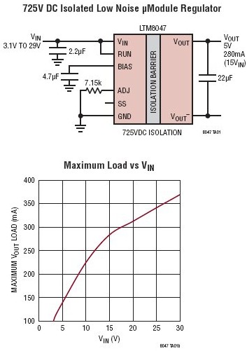 LTM8047 可操作于3.1V至32V的輸入電壓,支持 2.5V 至 12V 的輸出電壓范圍 (由單個(gè)電阻器來(lái)設(shè)定)。LTM8047 的封裝中內(nèi)置了開(kāi)關(guān)控制器、電源開(kāi)關(guān)、變壓器以及所有的支持組件??梢圆捎闷渌M件來(lái)控制軟起動(dòng)控制和偏置。僅需采用輸出、輸入和旁路電容器便可實(shí)現(xiàn)完整的設(shè)計(jì)。