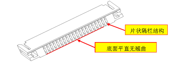 ??? 塑膠體內(nèi)部是等間距的片狀隔欄結(jié)構(gòu),使端子裝配后保持小間距的排列和提供一定的保持力。根據(jù)產(chǎn)品的使用要求,塑膠體要有足夠的強(qiáng)度和韌性,且在SMT焊接前后都不能有翹曲變形。下文將具體介紹塑膠體的設(shè)計(jì)及原料選擇。